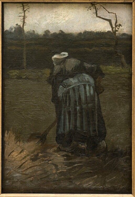 Het Noordbrabants Museum, 's-Hertogenbosch: figuurstudies van werkende boeren op de akker symboliseerden voor Vincent de eenheid van de mens met de natuur. Hij schilderde deze boerin sterk voorovergebogen om nadruk te leggen op de dynamiek van het spitten: de actie uitbeelden vond hij essentieel en modern. Dit werk moest deel uitmaken van een serie over het landleven. Hoe een werkende boerenfiguur in een grotere compositie zou functioneren, laat een doek zien uit Van Goghs (uiteindelijk niet uitgevoerde) eetkamerdecoratie voor het huis van Hermans in Eindhoven.